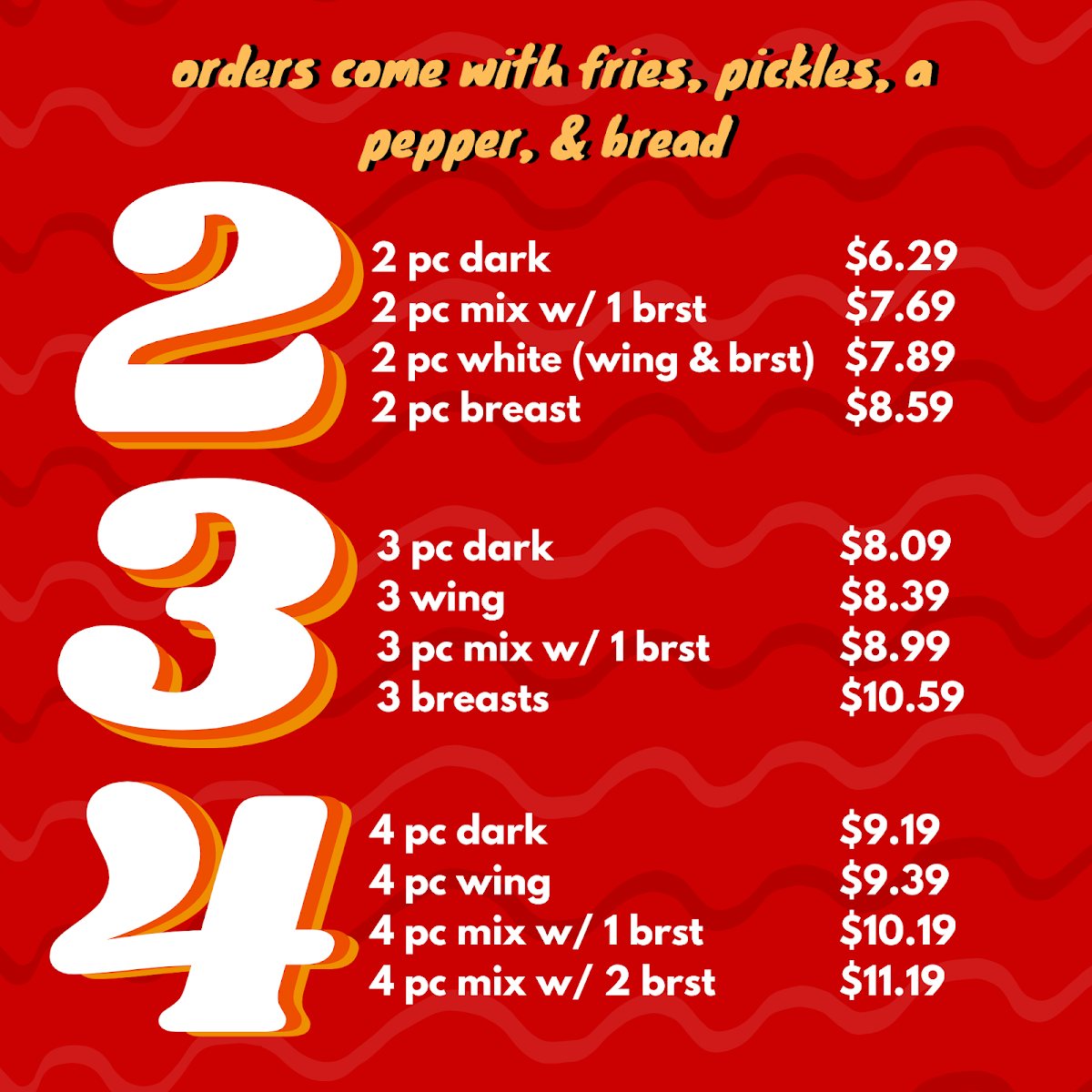 The 10pc Mix comes with 2 breast, 2 wings, & 6 dark pieces. Comes with Large Fries, pickles, 5 peppers, 5 slices of bread.