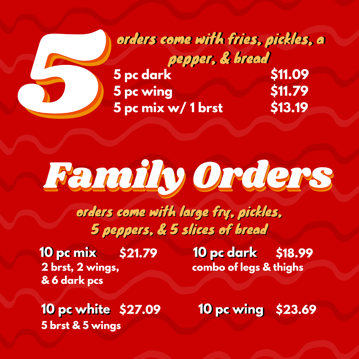 10 pieces of fried chicken, featuring 5 breasts and 5 wings. Comes with Large Fries, pickles, 5 peppers, 5 slices of bread.